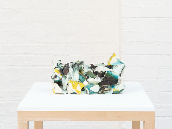 ceramic fragments, 'sun yellow' stain, fragments of ceramic with salt-evaporated self glazed surface, copper oxide, terracotta, window glass.